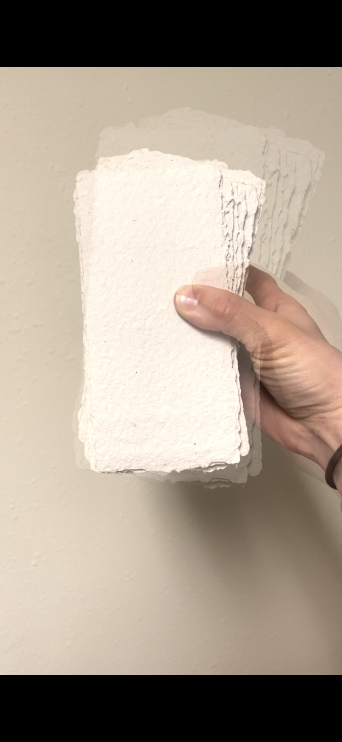 For this suite, I hand-crafted each piece of paper to achieve a unique, vintage-inspired texture. Starting with a 100% recycled paper pulp blend, I pulled each sheet individually using deckle molds to create soft, feathery edges. The pulp was pressed and dried carefully to ensure each sheet had a slightly different, organic shape and thickness, adding to the handmade feel. I made three different shapes and shades bringing subtle variation to the suite while maintaining a cohesive look.